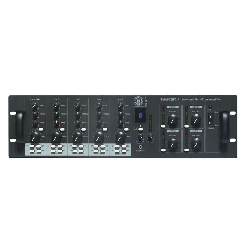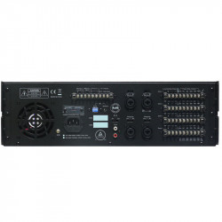 Amplificatore professionale a 4 zone •Professional 4 zones amplifier •5 channel mixer •4 zone separate power outputs •240w total power •Output costant voltage: 25v, 70v, 100v Power Supply: 110-120V~ 60Hz or 220-240V~50/60Hz Selectable Inputs Sensitivity: CH1- 4:Mic/Phantom:-50dBV; Line: -10dBV balance CH5: -10dBV unbalance Telephone paging: -10dBV Frequency response: 60-17000Hz(-3dB) Tone control: Treble: 10dB at 10KHz Bass: 10dB at 100Hz T.H.D.: <1% S/N ratio: Mic. >65dB Line >75dB Tel. >65dB Priority for Mic-1: mute CH2-CH5 Outputs impedance: 4 ohms , 8 ohms Output constant voltage: 25V,70V,100V Power output: RMS120W X 4 (at 4 ohms ) Monitor output: 1W RMS Phone output: 1V ( 47ohm) Line out: 2.0V(BAL) Monitor Line out: 1V( 600 ohms) Controls: 5 Gain controls for Ch1-5 8 Volume controls for Ch1-5, tel. Paging, monitor, phone 4 Master volume control 5 Trebel controls 5 Bass controls 4 Zone select switch for each channel 4 Zone monitor select switch 5 mute controls 1 AC select switch Indicate LED: 5VU meters (LED type) 1 Power indicator 5 Mute indicators