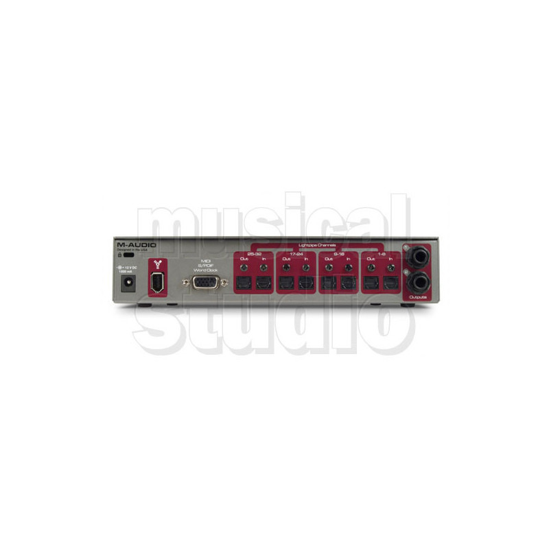 INTERFACCIA DIGITALE FIREWIRE 34-in/36-out M-Audio ProFire Lightbridge e un'interfaccia digitale fino a 2bit/96KHz disegnata per soddisfare le esigenze di oggi. Registrando fino a 3ingressi direttamete da un mixer digitale o attraverso i lproprio setup di convertitori si possono acquisire anche le performance piu ricche. 3uscite permettono di interfacciarsi con molteplici console di missaggio, rendendo M-Audio ProFire Lightbridge un interfaccia completa. CARATTERISTICHE TECNICHE 3canali ottici I/O a 44,1KHz o 48KHz 1canali ottici I/O a 88,2KHz o 96KHz utilizzando il protoccol SMUX S/PDIF I/O due uscite analogiche jack 1/4" bilanciate TRS con controllo volume dedicato ingressi ed uscite digitali ed analogiche attivi simultaneamente(er un totale di 34x3canali a 44,1KHz, 18x2a 88,2KHz o 96KHz) word clock I/O MIDI I/O uscita cuffie frontale con jack 1/4" e controllo volume didicato connessione al computer attraverso FireWire indicatori per frequenza di campionamento I/O ottici, I/O MIDI, sync e power alimentazione attraverso prota FireWire a poli incluso alimentatore (nel caso di utilizzo con porta FireWire a poli) formato mezza unita rack compatibilita ASIO II, WDM, Core Audio, GSIFII.