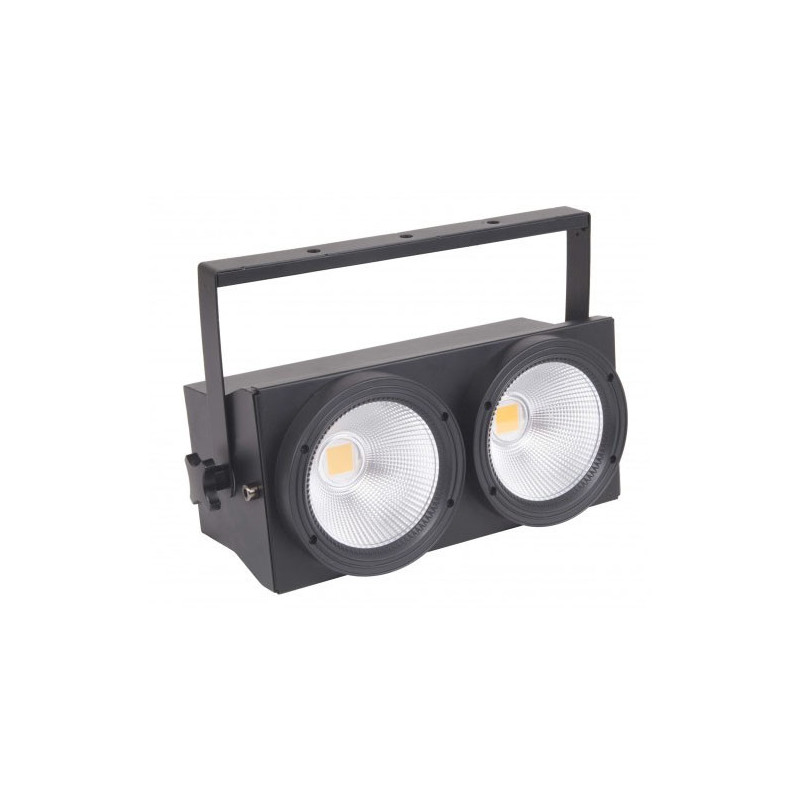 L’attuale tecnologia ci consente di sostituire i tradizionali blinder ad incandescenza con una nuova serie di proiettori, dotata di una particolare sorgente led COB ingrado di emulare la luce abbagliante che contraddistingue una delle più famose famiglie di proiettori per l’intrattenimento live. Come da tradizione due sono le taglie in gioco, Blinder led 2 e Blinder led 4, entrambe le versioni offrono la possibilità all’utente di comandare ogni singola sorgente o tutte insieme, come nei più comuni utilizzi. La speciale parabola consente un’emissione diffusa capacie di coprire una superficie ampia. Scheda Tecnica Blinder led 2 Sorgente luminosa • 2X100W COB led • Vita media sorgente LED: >50.000h • Frequenza diodi led: >400Hz anti-flicker Ottica • Angolo di proiezione: 45° • Luminosità: 535lux @ 4mt Sistema colori • Sorgente COB led warm white 3200K Effetti • Dimmer lineare ad alta precisione da 0 a 100% • Strobo: elettronico 1-20 flash/s indipendente a velocita variabile • Controllo singolo dei led Controllo e programmazione • 3 configurazioni DMX disponibili: 1/2/6 canali • Controllo segnale USITT DMX 512 • Modalità Master/Slave selezionabile • Modalità Sound con sensibilità microfono regolabile • Modalità Automatica con la possibilità di richiamare da display 3 programmi personalizzabili con regolazione indipendente della velocita e strobo Struttura e corpo mobile • Struttura in metallo di colore nero • Display LED di colore rosso • Sistema di ancoraggio con doppia staffa per ancoraggio in quota ed appoggio a terra • Connessione di segnale DMX Ingresso e uscita XLR 3 poli • Grado di protezione IP 20 Alimentazione • Input Voltage: AC~100-240V 50/60Hz • Alimentatore switching universale • Consumo 120W • Connessione alimentazione IN/OUT Powercon • Cavo alimentazione 1,5 mt incluso • Alimentazione OUT massimo 8 pcs @240V Peso e dimensioni • Peso netto: 3,6kg • Dimensioni: 370x150x240mm