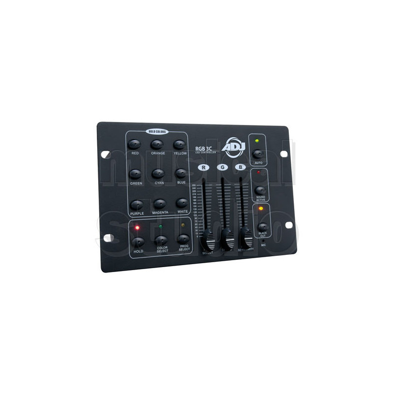 RGB 3C RGB3C è un controller di base a 3 canali RGB a LED. È stato progettato per il controllo di qualsiasi apparecchiatura RGB standard a 3 canali, dove il canale 1 è il Rosso, il canale 2 è il Verde ed il canale 3 è il Blu. Tutte le apparecchiature a LED devono essere impostate per funzionare in modalità DMX ed essere indirizzate al canale 1 DMX. Il pannello di controllo delle unità include nove pulsanti di colori “statici" ad accesso diretto, con preselezione pre-programmata del colore, tre fader RGB manuali per impostazione "al volo" del colore scelto, un pulsante di selezione programma per l'accesso a 10 programmi chase e 7 programmi di colori statici tramite il fader di selezione programma, un pulsante Sound-active per l'attivazione tramite microfono interno, in sequenza casuale, di 10 programmi chase, un pulsante di esecuzione Auto per l’attivazione in sequenza casuale dei 10 programmi chase con velocità controllata tramite fader di velocità, un pulsante Hold che sospende la scena in esecuzione e la mantiene in memoria anche in caso di disattivazione dell'alimentazione elettrica, ed infine un pulsante Blackout che ripristina tutti i valori a zero interrompendo qualsiasi uscita dall'apparecchiatura. La soluzione ideale per DJ, piccoli night club e bar che desiderano un controller a LED semplice per eseguire i propri spettacoli luminosi. Specifiche tecniche: - connettore di uscita DMX: XLR a 3 pin - Alimentatore in ingresso: 9-12 V 300 mA (incluso) - Assorbimento: 3,6 W - Dimensioni: cm. 22 x 14 x 6,3 - Peso: kg. 0,8