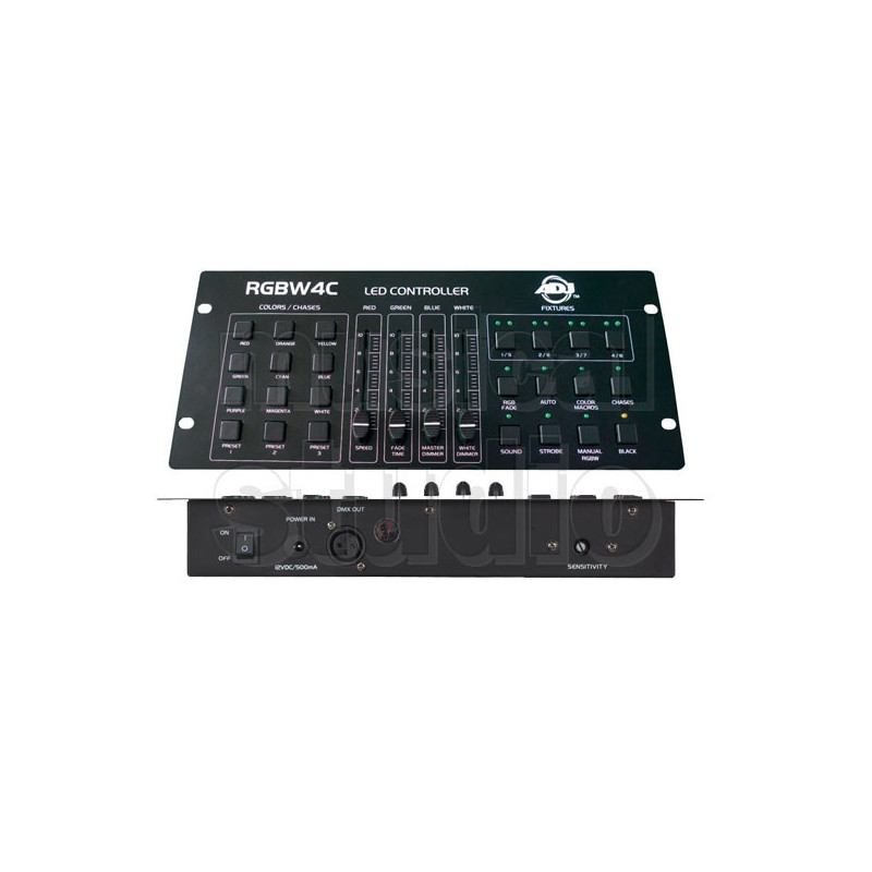 RGBW4C è un controller a 32 canali a LED RGB, RGBW o RGBA. È stato progettato per controllare qualsiasi gruppo di apparecchiature a LED standard a 3 o 4 canali in cui il canale 1 è il Rosso, il 2 il Verde, il 3 il Blu ed il 4 il Bianco oppure l'Ambra. Tramite i quattro pulsanti dell'apparecchiatura è possibile controllare in maniera indipendente fino a 8 apparecchiature a LED o gruppi di apparecchiature. Tutte le apparecchiature a LED o gruppi di apparecchiature devono essere impostati per l'esecuzione in modalità DMX ed indirizzate su quattro canali separati per il controllo indipendente. Il pannello di controllo delle unità comprende 9 pulsanti “Static Color/Chase” (colore statico/chase), che contengono colori pre-impostati e programmi chase, 3 pulsanti per colori pre-impostati programmabili da parte dell'utente, 4 fader multifunzione che controllano 'al volo' le intensità RGBW e la velocità di programma chase, il 'fade time' e il 'master dimmer' del programma chase. È inoltre presente una serie di 8 pulsanti utilizzati per selezionare la modalità di funzionamento inclusi RGB fade, auto run, macro colore, chase, attivazione sonora, stroboscopio, modalità RGBW manuale e blackout. RGBW4C è uno dei controller a LED più semplici e versatili disponibili oggi sul mercato. È ideale per DJ, night club, sale d'aspetto, bar e per chiunque desideri un semplice controller per proiettori a LED, barre, riflettori o pannelli. Caratteristiche: -Controller DMX512 compatto per apparecchiature a LED RGB, RGBV e RGBA -Controlla fino a 8 apparecchiature singole o gruppi di apparecchiature -Pulsanti di accesso diretto a 3 pre-impostazioni di colore programmabili dall'utente -Pulsanti di accesso diretto a 9 pre-impostazioni di programma colore/chase -Modalità riproduzione macro colore -Modalità controllo intensità RGBW manuale -Modalità auto e RGB -Controllo velocità e fade 'al volo' di tutti i programmi chase -Modalità attivazione sonora tramite microfono interno -Sensibilità microfono regolabile -Stroboscopio variabile -Pulsante blackout Specifiche tecniche: - Uscita DMX: XLR a 3 pin - Alimentazione: alimentatore da 12 V CC 500 mA a norme UL (incluso) - Assorbimento: 3,6 W - Dimensioni: mm. 327 x 140 x 48 - Peso: 1,1 kg.