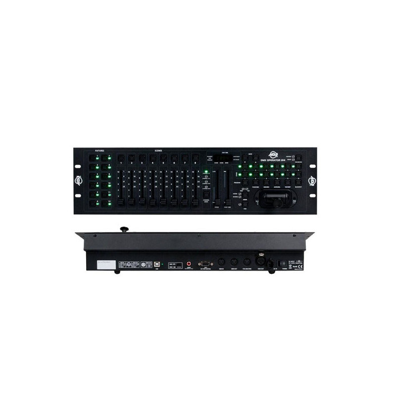 CONTROLLER DMX / MIDI 384 CANALI Il DMX Operator 384 è un controller montabile su rack da 19" che controlla DMX e Midi. si può controllare fino a 384 canali DMX, ed è dotato di 30 banchi di scene programmabili (240 scene programmabili in totale), 12 chase programmabili ed un joystick assegnabile. Caratteristiche principali •2 Controller in 1 (controller DMX e MIDI) •12 Fixture - 32 canali DMX ciascuna, 384 canali totali •30 banchi di scena programmabili - 240 scene programmabili totale •12 Chase programmabili •8 Fader di controllo x banchi 4 canali •Joystick assegnabile •Fader Speed e Fade •Microfono integrato o ingresso audio di linea RCA •Ingresso MIDI per il trigger di scene, chase or blackout •Pulsante Tap Sync •Ingresso macchina del fumo e pulsante di attivazione (solo con ADJ VF1300 ) •Ingresso RS-232 •Tasto Blackout