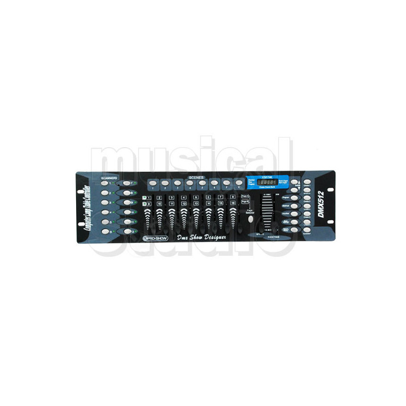 Mixer Luci Dmx Show Designer Ideale per Stage, Live, eventi 192 controlli canale per 12 proiettori su 16 canali. 6 chaser con 240 scene programmabili. 8 Scene preset. Funzione Copy per scene, programmi e registrazioni. Funzione Blackout. Sound control via microfono. Installazione a rack 3 unità. IDEALE PER Stage, Live, eventi SPECIFICHE TECNICHE Power supply: 230 V AC, 50 Hz ~ via 9-12 V DC, 300 mA power unit included in the delivery Power consumption: 4 W Number of control channels: 192 Sound-control: via built-in microphone DMX512 output: 3-pin XLR connector with polarity selector Free chasers: 6 x 240 scenes Dimensions (LxWxH): 483 x 132 x 80 mm Rack installation with 3 u Minimum mounting depth: 170 mm Weight: 2.5 kg