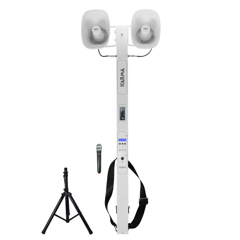 Sistema di diffusione per gruppi itineranti, processioni o manifestazioni anche all’aperto. E’ costituito da un amplificatore da 50 Watt, munito di batteria ricaricabile interna che le conferisce un’autonomia di circa 4 ore. La colonna può essere comunque alimentata anche tramite il trasformatore a 220V. Attacco 12V permette di collegarla alla presa accendisigari dell’automobile per un utilizzo immediato anche a batteria scarica. Monta due compatte trombe acustiche orientabili ed è dotata di cinghia per l’impiego durante il cammino. In dotazione è fornita di un radiomicrofono UHF a 16 canali che permette di amplificare la propria voce liberi da cavi di collegamento.